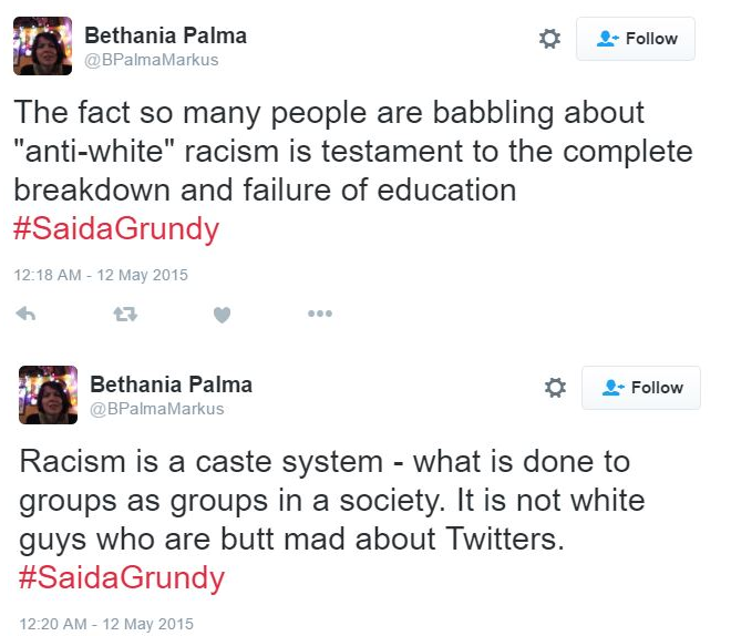 After Boston University professor Saida Grundy was criticized for racist tweets in which she called white, college-aged males a “problem population,” Palmo Markus suggested Grundy’s tweets weren’t actually racist because they were directed at white people.