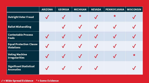 This report assesses the fairness and integrity of the 2020 Presidential Election by examining six dimensions of alleged election irregularities across six key battleground states. Evidence used to conduct this assessment includes more than 50 lawsuits and judicial rulings, thousands of affidavits and declarations, testimony in a variety of state venues, published analyses by think tanks and legal centers, videos and photos, public comments, and extensive press coverage.